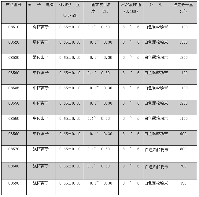 陽離子聚丙烯酰胺一般分為:強陽離子、中陽離子、弱陽離子